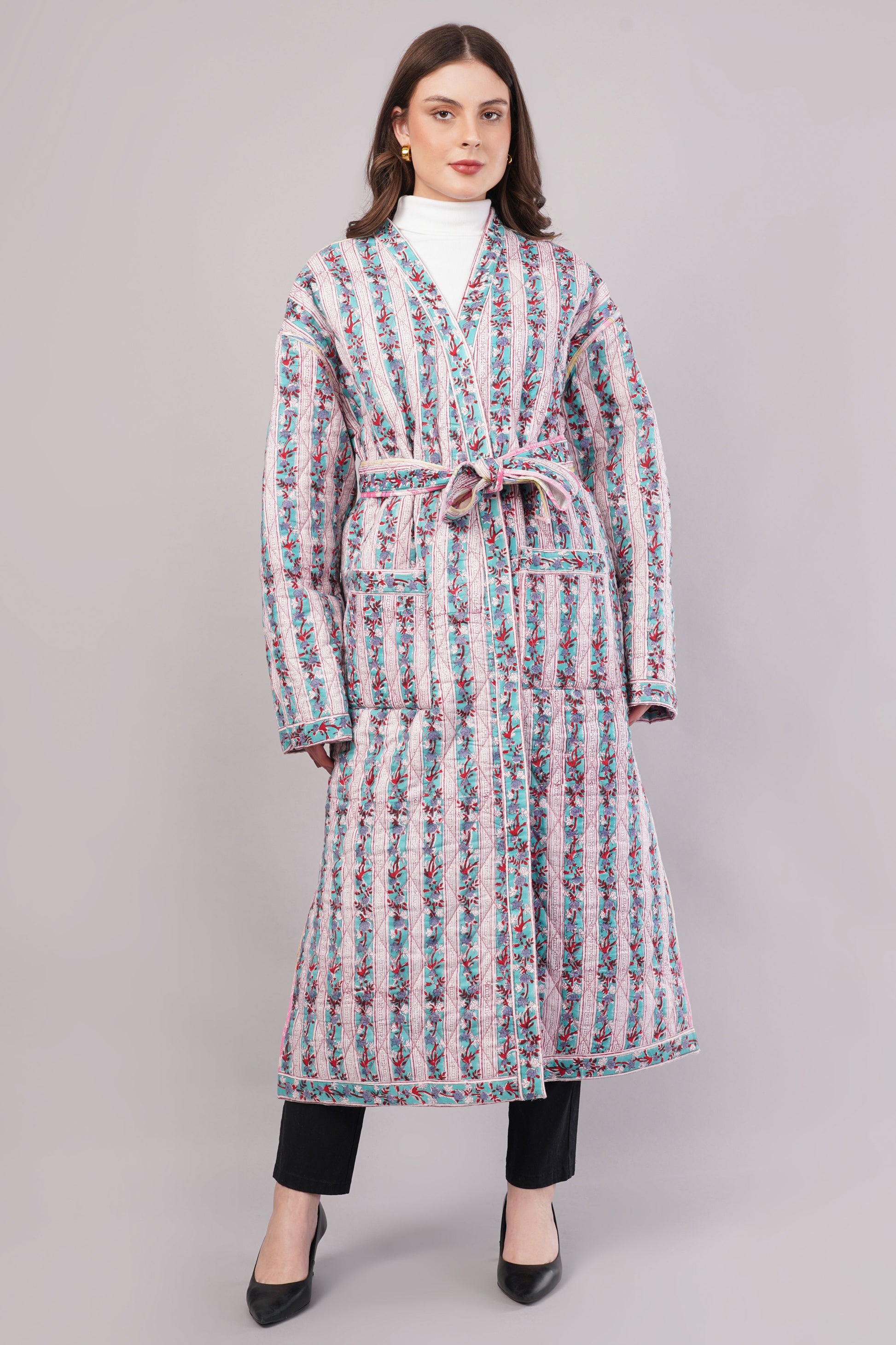 Indulge in comfort and creativity with our Reversible Quilted Cotton Robe, a wearable work of art designed for those who love versatility and bold design. This long robe features two distinct sides: