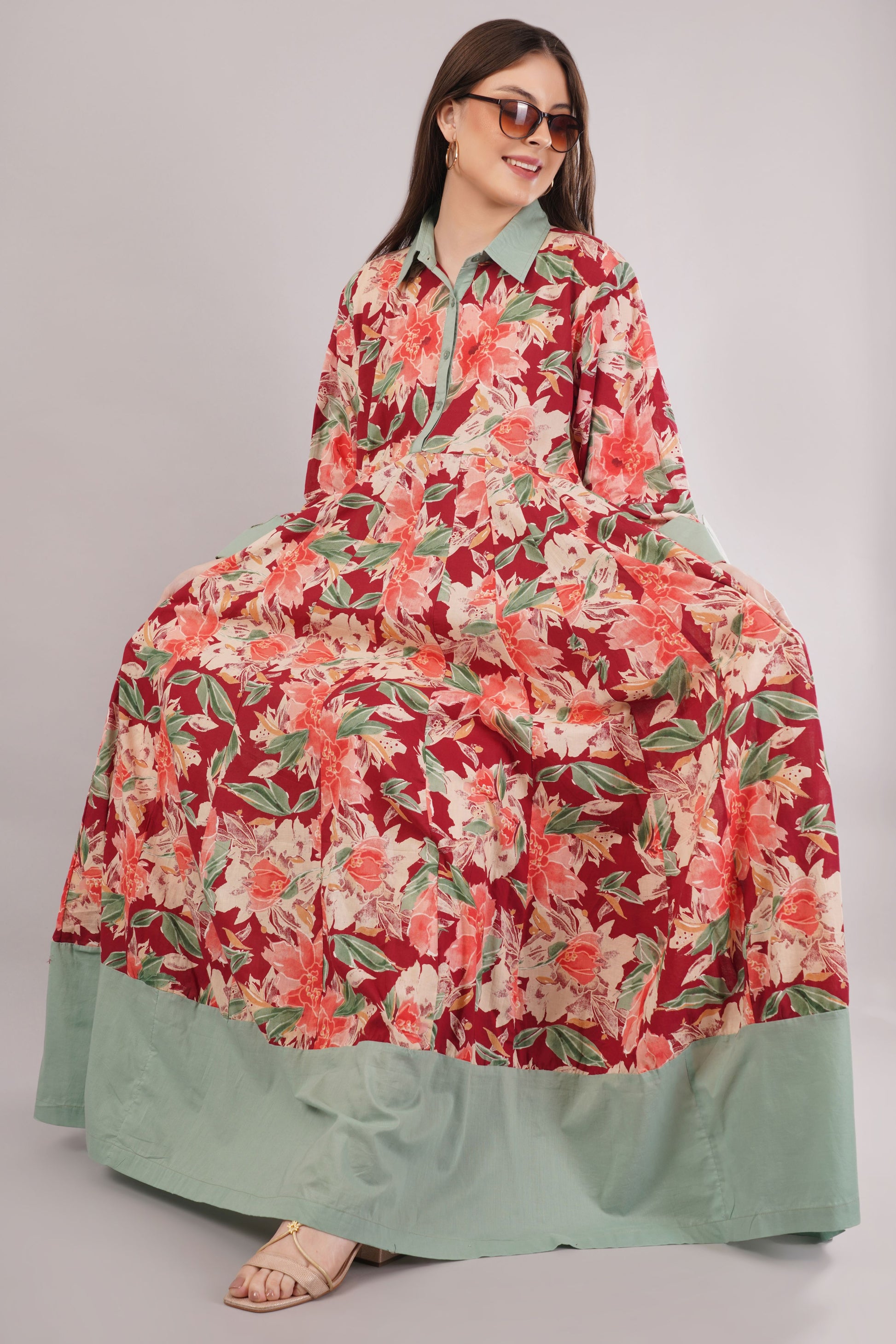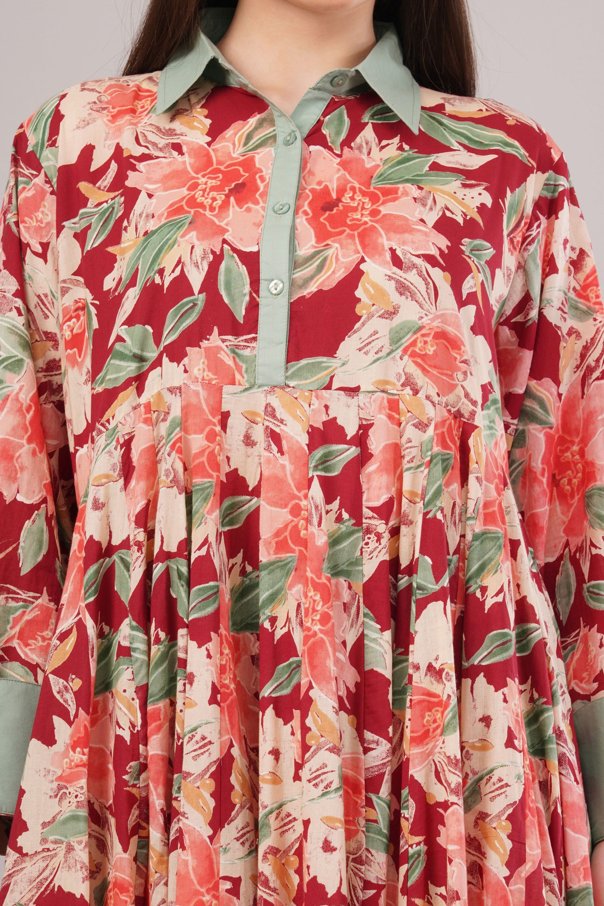 Red Floral Cotton Kaftan with Green Collar – Bold, Breezy & Stylish