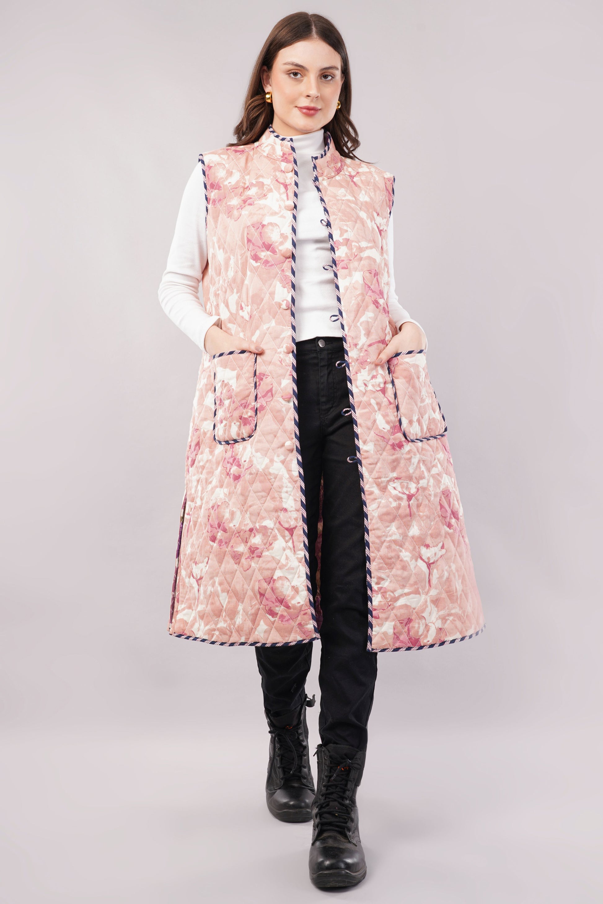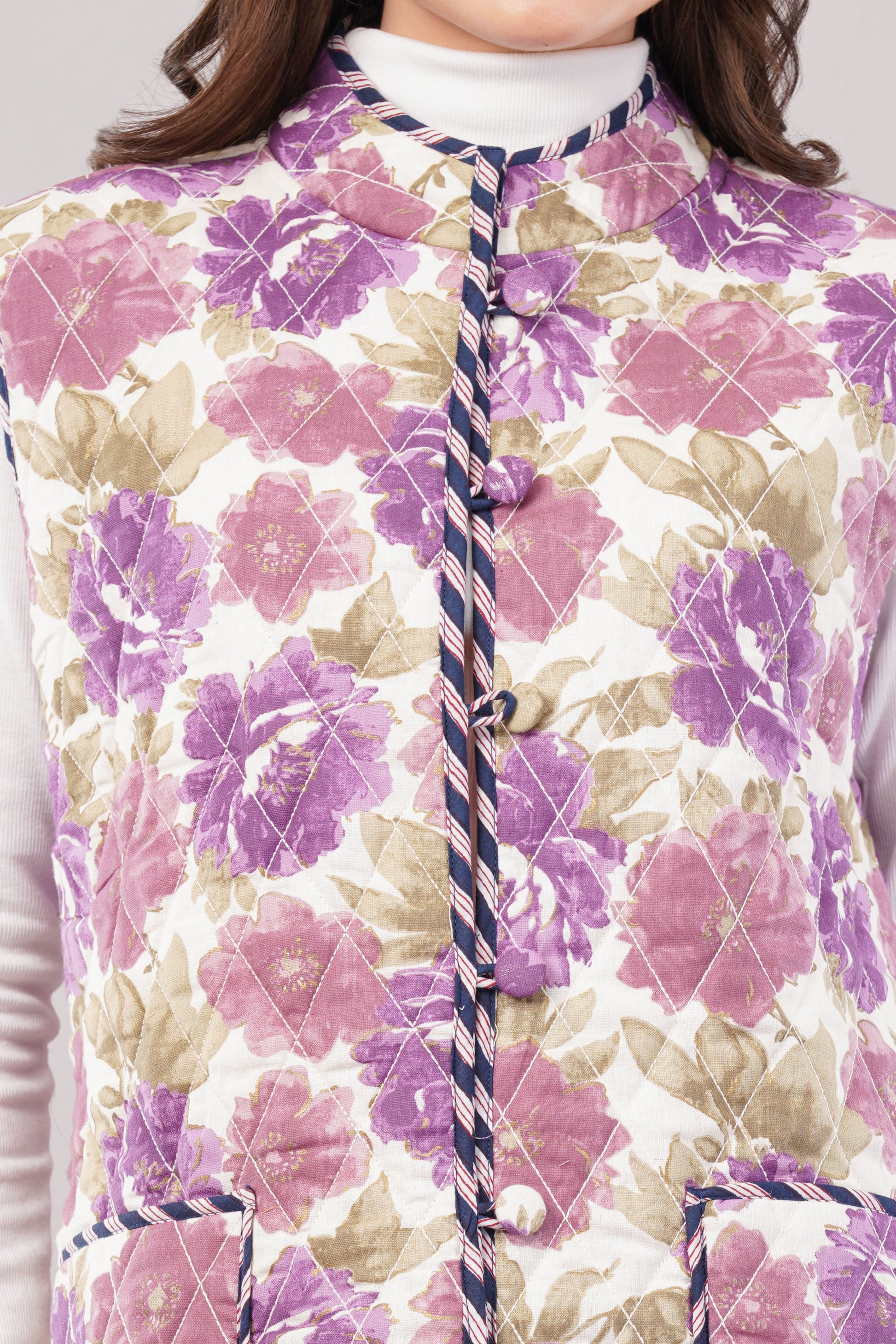 Embrace elegance and versatility with our Reversible Quilted Cotton Vest, a sleeveless layering piece that blends soft florals with structured charm. Designed for comfort and visual impact, this vest offers two distinct styles: