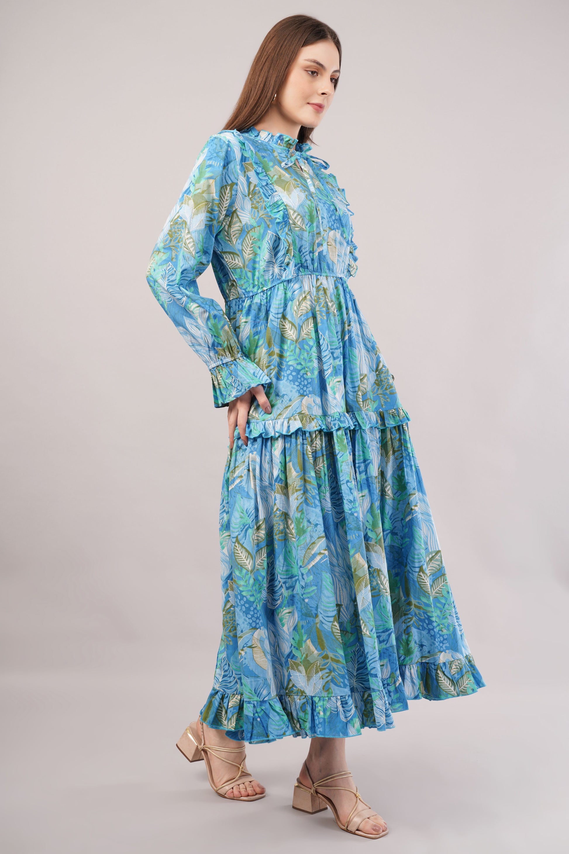 Tropical Blue Cotton Kaftan – Leafy Print with Bow Tie Neck & Tiered Skirt